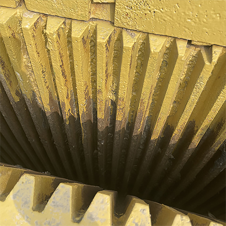 PE顎式碎石機當推力板磨損嚴重或前推力板折斷時,將破碎腔內的礦石清除掉,取出磨廢或折斷的推力板,並檢查(chá)動顎和連杆上(shàng)的肘(zhǒu)板有無損壞。然後把動顎拉到固定顎附近,將肘(zhǒu)板的工作表麵(miàn)用幹油(yóu)潤滑後換上新推力板,使它與肘板工(gōng)作(zuò)表麵慢慢接(jiē)觸,並(bìng)拉緊水(shuǐ)平拉杆,使動顎把推力板夾住,擰緊安全罩,連接潤滑係統,然(rán)後調整好排礦口尺寸。